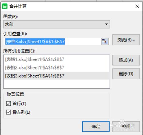 依次点击引用位置右侧的小框,依次选择表2,表3,都点击添加。