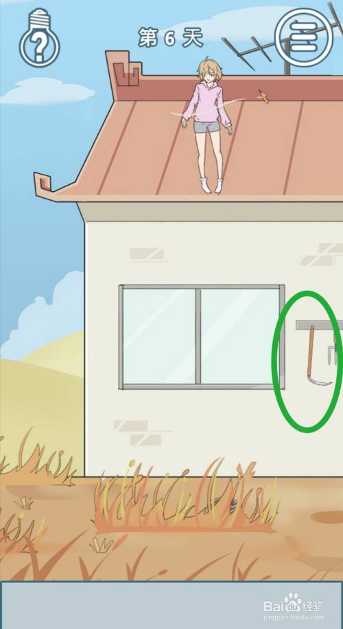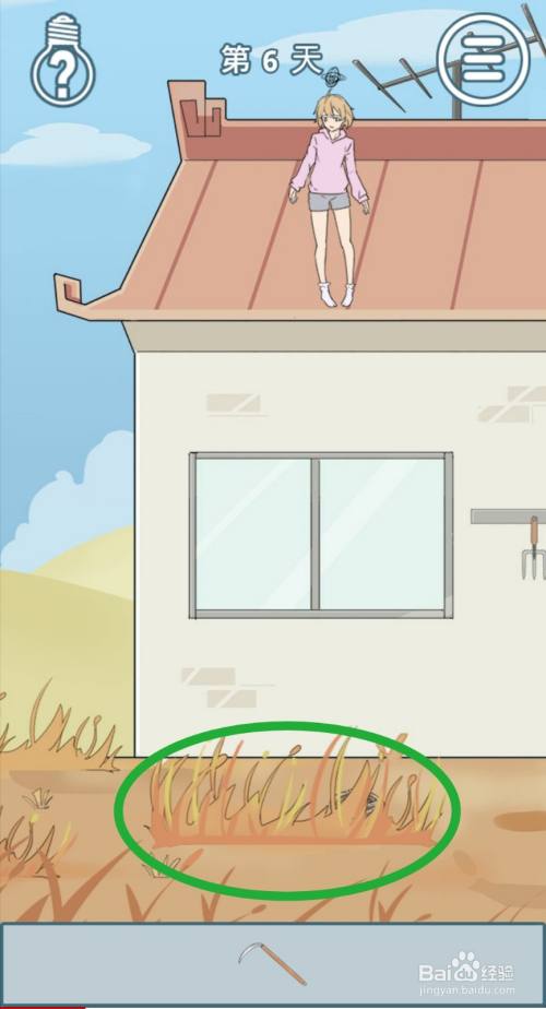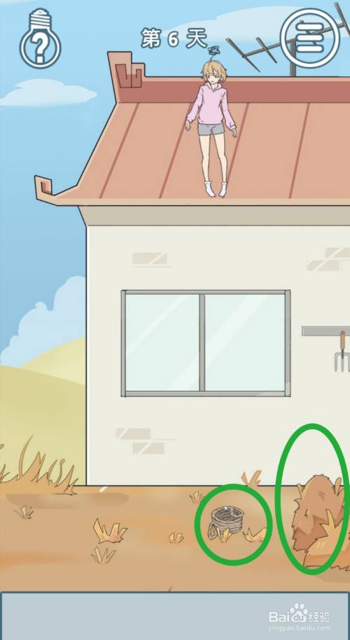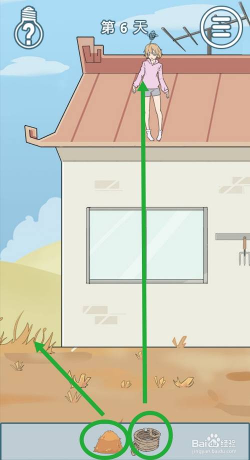 女本家儿顺着绳索落到麦堆上,就可以平安分开房顶了,游戏过关。