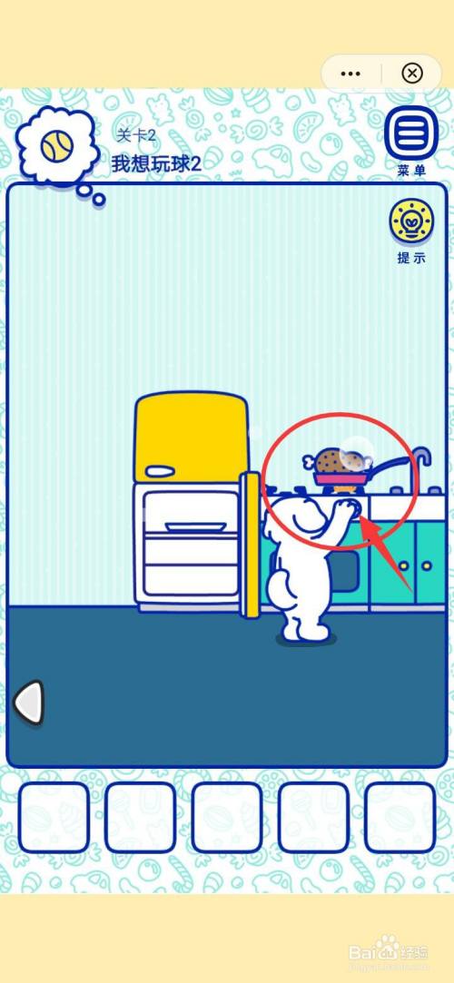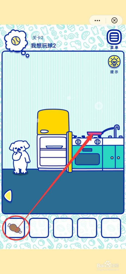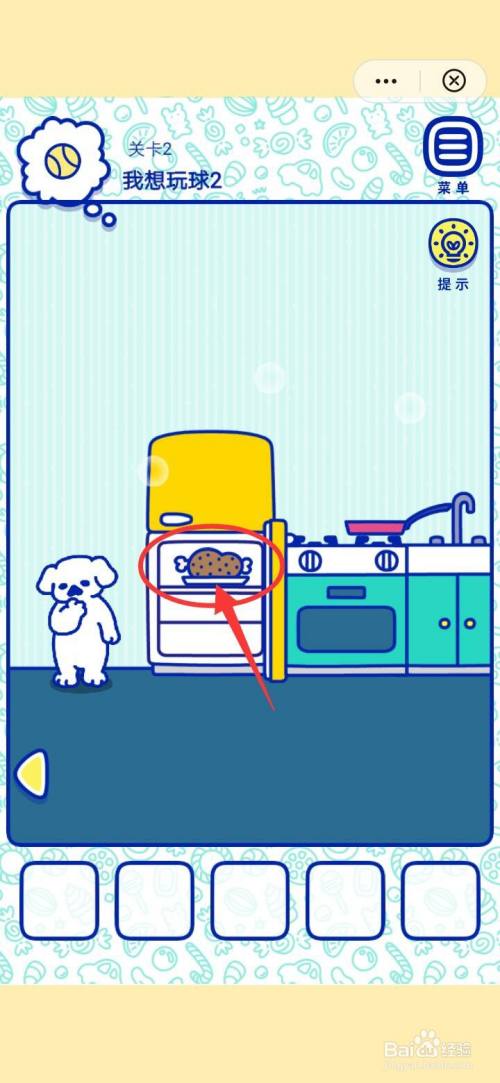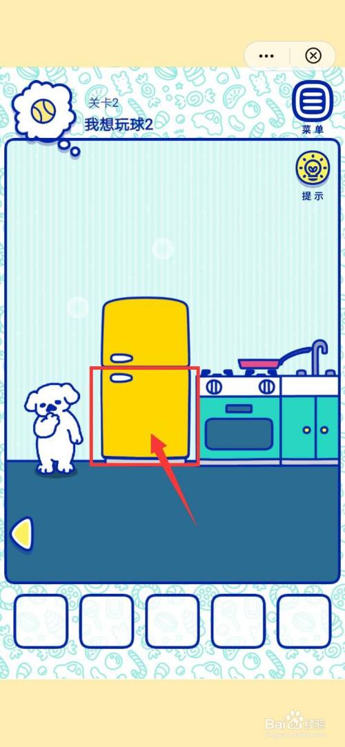 点击萌犬糖果的心愿2我想玩球2右下角的三角图标,在厨房中打开冰箱门