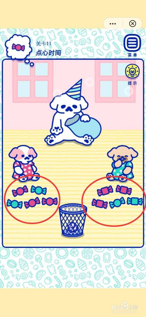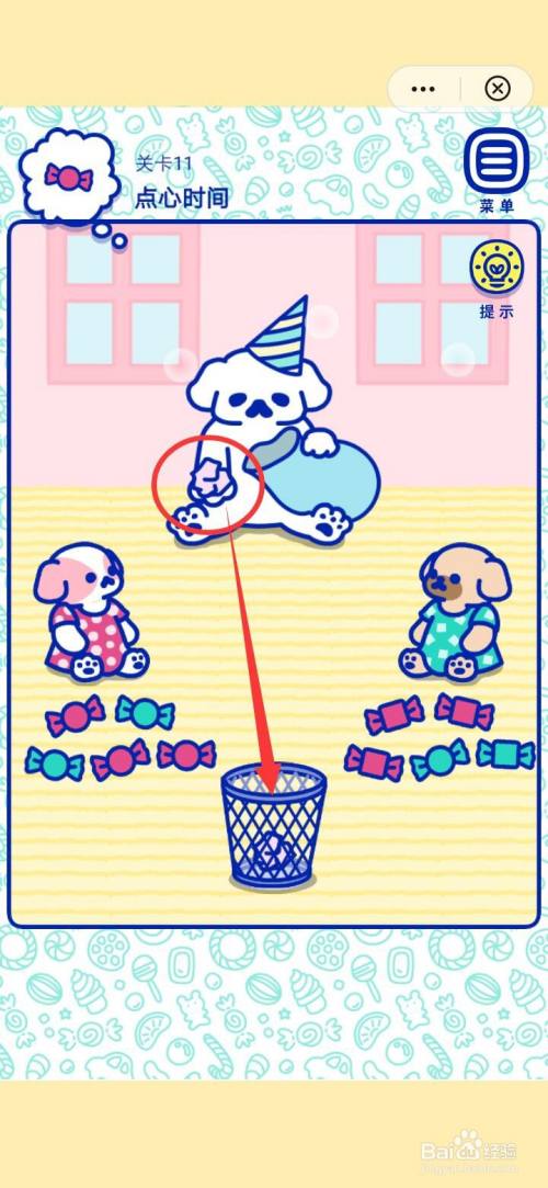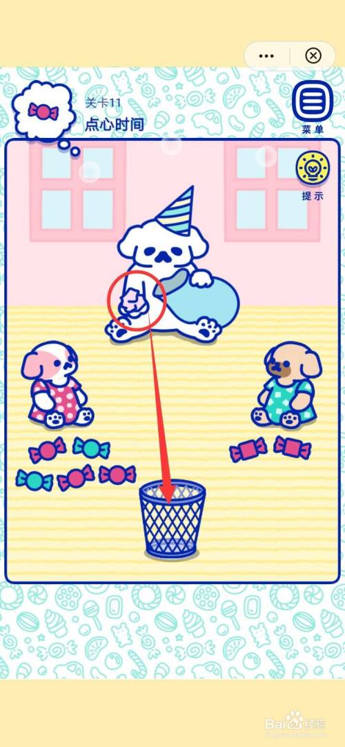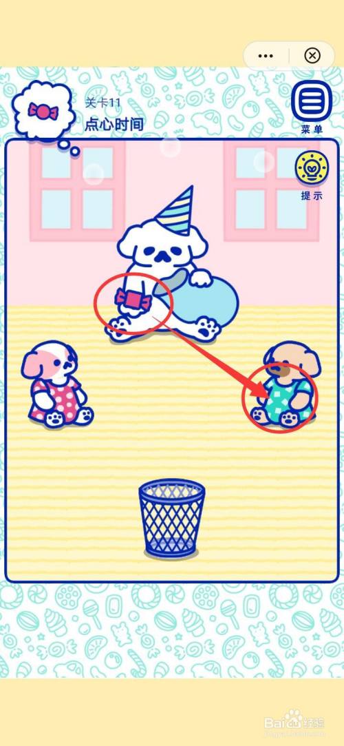 第三步,在将萌犬糖果的心愿11点心时候中的圆形糖移给左边小狗后,把糖果手上的纸团移到垃圾桶里