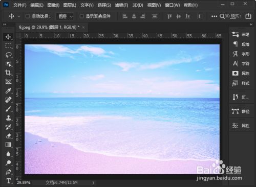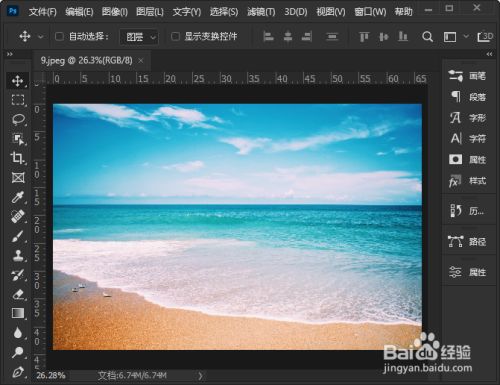 我们用ps打开一张海边的图片(此刻看到沙岸是金色的)。
