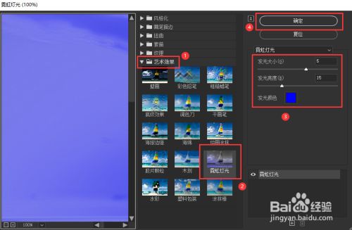 我们在【艺术结果】里面选择【霓虹灯光】,然后把发光大小设置为【5】,发亮光度为【15】,发光颜色为【深蓝色】,点击【确定】。