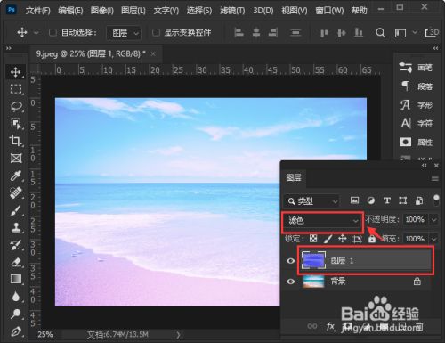 我们把图层1(酿成蓝色结果的图片)的图层模式设置为【滤色】。