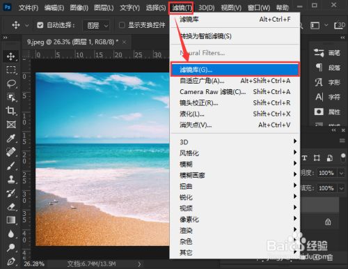 接下来,我们选中图层1的图片,然后在【滤镜】中找到【滤镜库】。