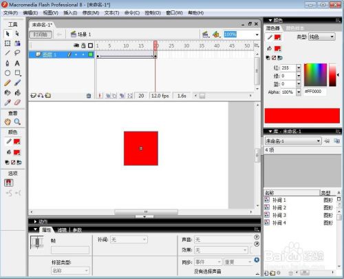 按回车键,我们就可以看到长方形逐渐酿成正方形的动画,用这种方式,我们就在flash中建立好了长方形酿成正方形的补间动画。