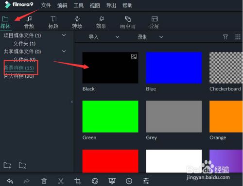 1.打开界面后,先在媒体选项中的布景样例中添加黑色布景