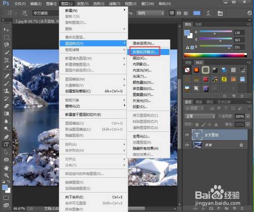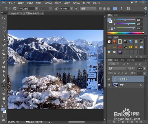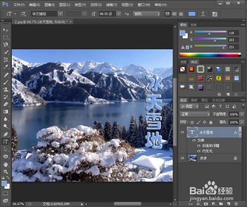 点击文字东西,选择蓝色,输入冰天雪地;