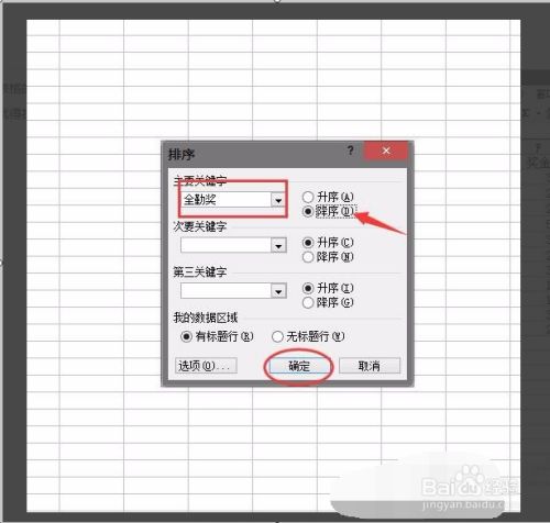 然后弹出排序窗口我们选摘要排序的全勤奖。然后进行降序摆列,点击确定。