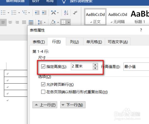 再接着主动打开的对话框中将行的尺寸点窜为指定高度2厘米。