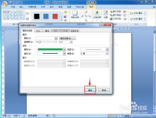 在设置自选图形格局中将圆形的线条颜色设为绿色,粗细设为4磅,然后按确定;