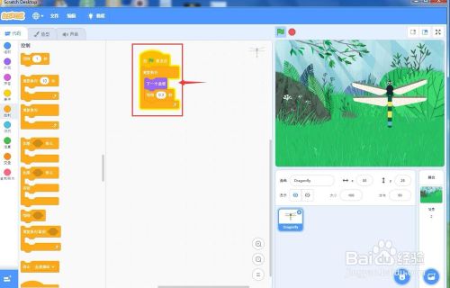 点击蜻蜓,添加如下剧本,让蜻蜓不竭切换造型,实现动画结果;