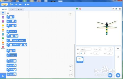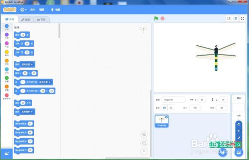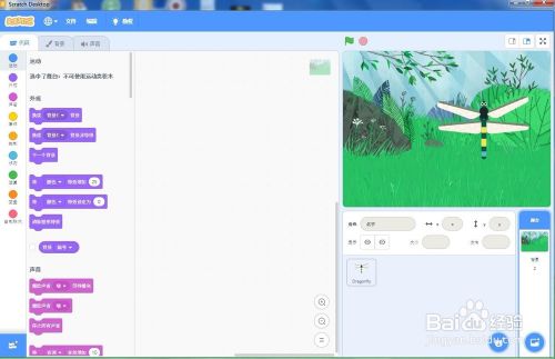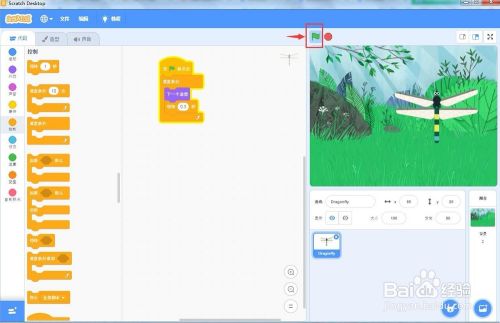 点击绿旗执行程序,丛林中的蜻蜓动画就建造好了。