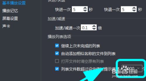 5、进入根基播放设置,点击【列表文件数跨越设定值则提醒清理】后边的【数值选择框】,下拉框出来后,点击选中具体数值,例如【500】;