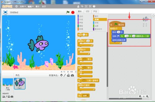 3、给小鱼添加剧本,让它在水下随机活动。