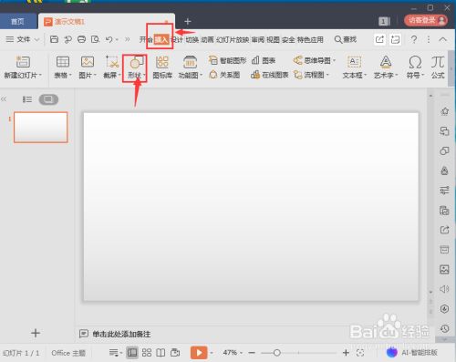 点击wps演示的插入菜单,选择外形;