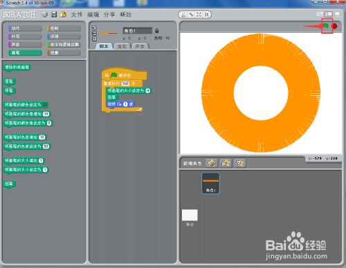 点击绿旗执行程序,我们就在scratch1.4中画好了一个黄色齐心圆。