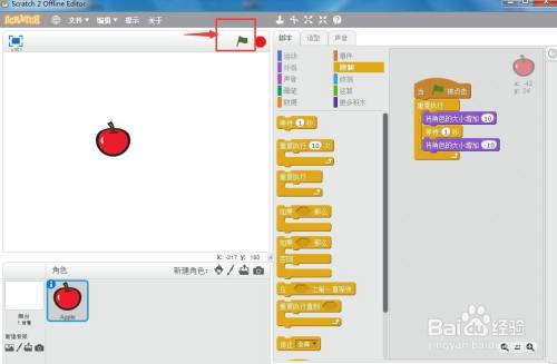 给苹果添加如下剧本,注重让苹果的大小增添然后减小;