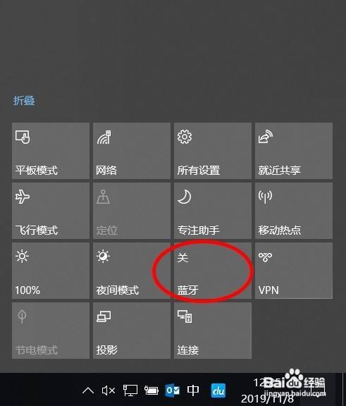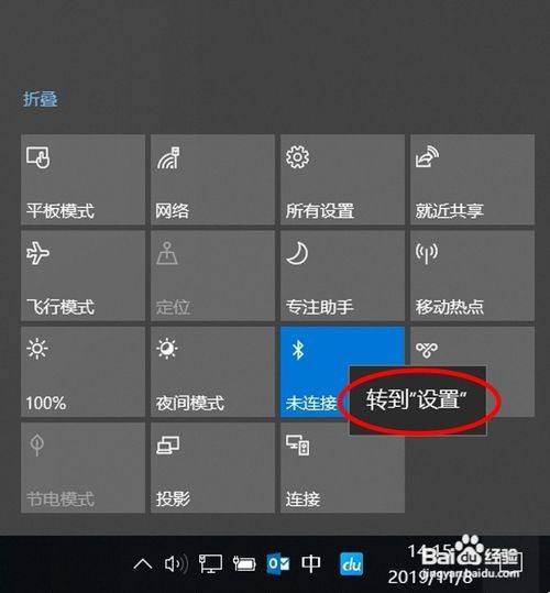 1、win10 系统的电脑点击通知栏的位置,找到蓝牙标记电脑需要撑持蓝牙右击后进入设置界面