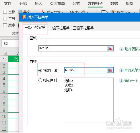 6、点击【一级下拉菜单】,然后在【指定区域】内输入E2:E5