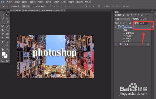 下面,我们退出夹杂选项面板,并在图层面板上找到文字图层的【填充】选项,如下图,默认填充值为100%,我们可以将它降低到0%~20%。