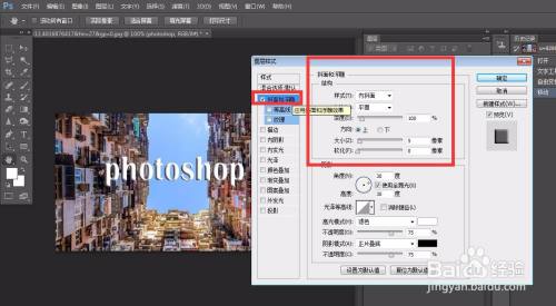 打开夹杂选项面板,我们首先需要给文字添加【斜面和浮雕】结果,如下图,大师可以参考小编的参数进行设置。