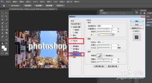 我们继续在【夹杂选项】面板上调节,选择【内发光】、【外发光】,使得文字呈现表里发光结果,参数值如下图。