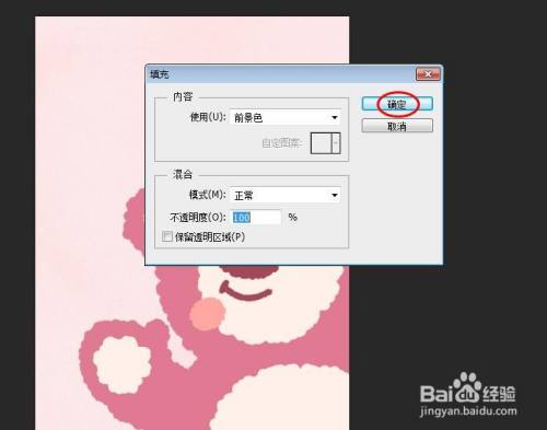 第六步:在弹出的填充对话框中,利用前景色并单击“确定”按钮。