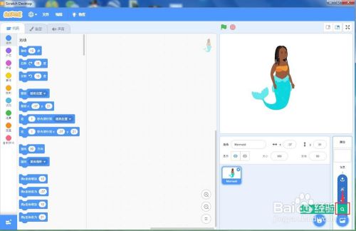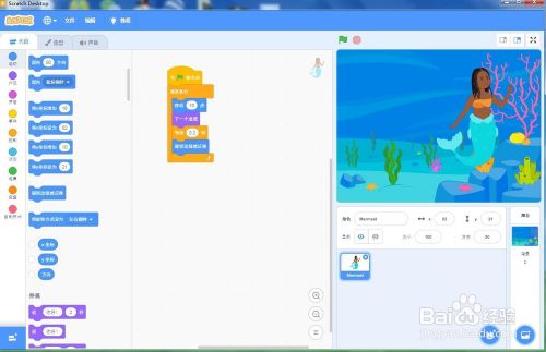 3、给佳丽鱼添加剧本,让她在水中移动,碰到边缘就反弹,同时切换造型并反复执行;