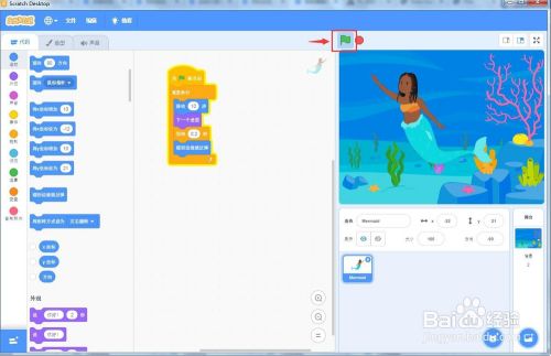 4、点击绿旗执行程序,在水中游动的佳丽鱼动画就做好了。