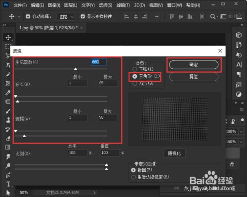 我们在海浪里面把生当作器数设置为【660】,波长最小为【1】,最大为【25】,波幅最小为【1】,最大为【98】,类型选择【三角形】,然后点击【确定】。