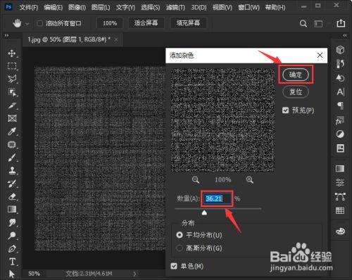 我们把添加杂色的数目设置为【36.21】%,点击【确定】。