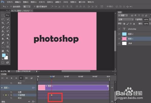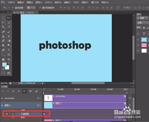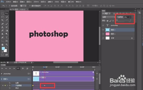 点开图层2【不透明度】前方的闹钟图标,定下第一个标识表记标帜点,然后移动时候轴滑块到后方,将图层二不透明度改为0,如下图,主动记实第二个转变点。