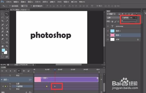 同时,我们点击图层1不透明度前方的小闹钟图标,定下第一个标识表记标帜点,然后移动时候轴滑块到后方,设置图层1不透明度为0 ,主动记实第二个标识表记标帜点。