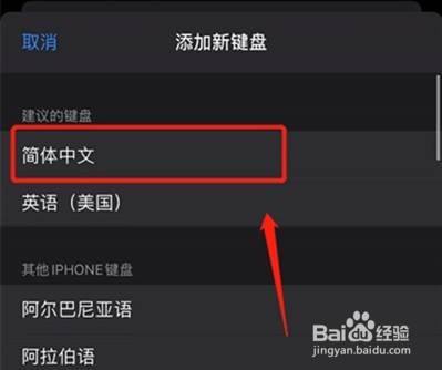 5、在【添加新键盘】页面,点击【简体中文】,如下图;