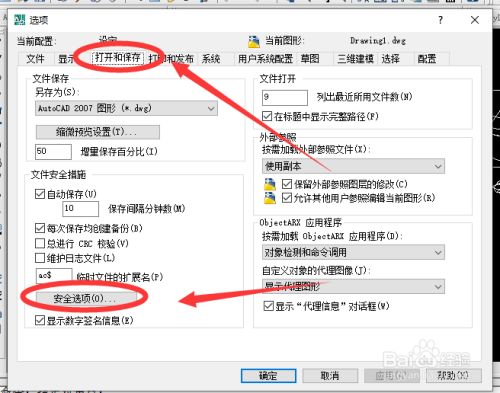 在“选项”对话框的“打开和保留”选项卡上,单击“平安选项”。
