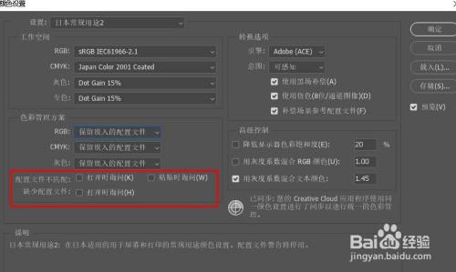 RGB、CMYK 和灰色选项下方是三个复选框。若是您选择(选中)这些选项,那么每次打开具有分歧颜色设置装备摆设文件或底子没有设置装备摆设文件的图像时,会提醒您如何处置它。为了避免这个问题,请不要选中这些选项。