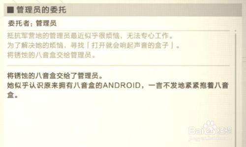 归去把八音盒交给办理员告诉他ANDROID的下落 就会完当作使命获得奖励 而且解锁仓库的大门