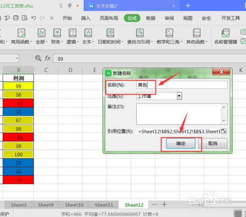 6、接着,在弹出的新建名称面板的【名称】处输入“黄色”从头定名,单击【确认】,并在弹出的名称办理界面单击【封闭】;