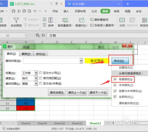 3、接着,单击【格局】选项,选择【从单位格选择格局】项下的【布景格局】选项,拔取我们需要的任一颜色单位格;本次案例拔取黄色布景的单位格演示,所以我们拔取任一黄色单位格;