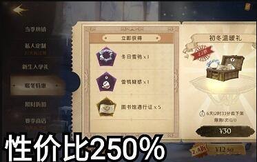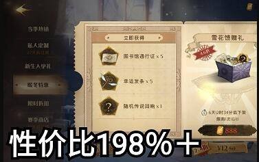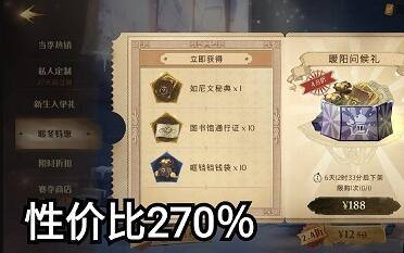 含有『图书券×5 发条×5 随机金回响×1』,此中性价比计较只包罗图书券和发条,这条目合用于转盘玩家,发条在礼包里其实是比力划算的,并且宝石在日常的使命开学院宝箱也可获得,所以它的性价比远高于188礼盒和30礼盒。
