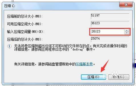 接着呈现压缩界面,需要调整【输入压缩空间量】,也就是我们增添一个分区空间大小,按照现实环境进行划分,然后点击【压缩】。