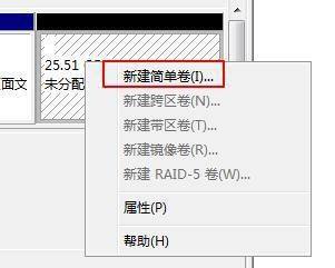 鼠标右击方才增添的分区【未分派】,选择【新建简单卷】。