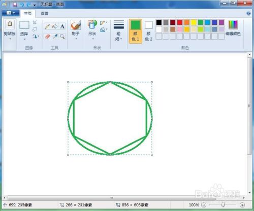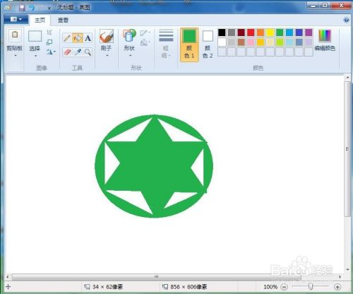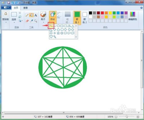 点击用颜色填充东西, 将所有对角线订交的部门填充上绿色,我们就在绘图中画好了一个带有外接圆形的六角星。