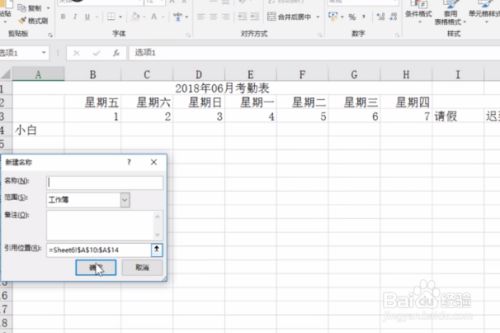 选中不消的空白列输入对考勤的标识表记标帜,然后点击鼠标右键选择“界说名称 ”,点击“确定”。