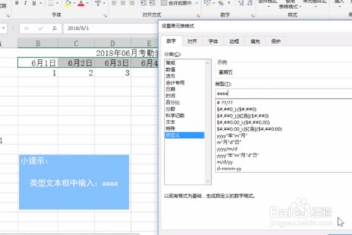 点击鼠标右键点击“设置单位格格局”选择“数字”点击“自界说”,在类型下的文本框中输入四个a。