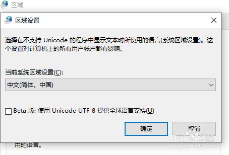 5、然后在弹出的区域设置窗口中,我们选择中文(简体,中国),打消勾选“Beta版”这个选项,也就是不利用Beta版这个不不变版本,然后点击“确定”。