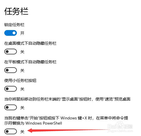 3.当我们进入使命栏设置页面后,在右侧页面找到“当我右键单击”起头“按钮或按下Windows键+X时,在菜单中将号令提醒符替代为 Windows powershell”的选项。