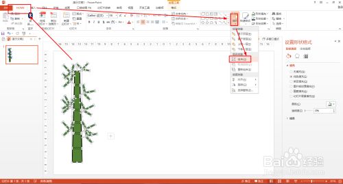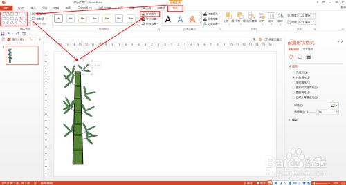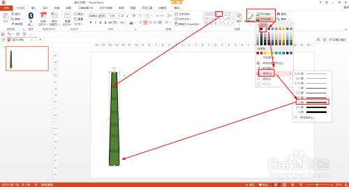 选择梯形——HOME——外形填充——选择绿色——外形轮廓选择黑色——粗细设置为3磅——用直线在梯形内画竹节,黑色设置为黑色。