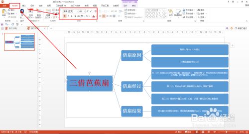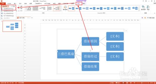 题目:三借芭蕉扇——二级题目:借扇原因、借扇颠末——SMARTART东西——设计——添加外形——在后面添加外形,添加多一个二级文本框,输入:借扇成果。