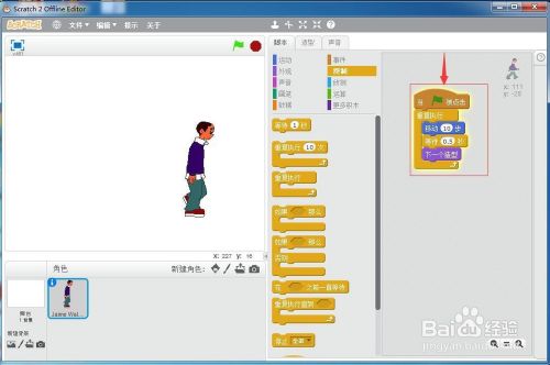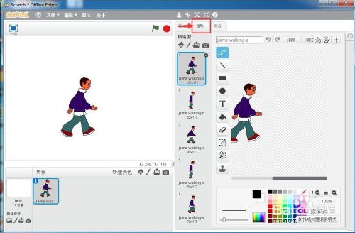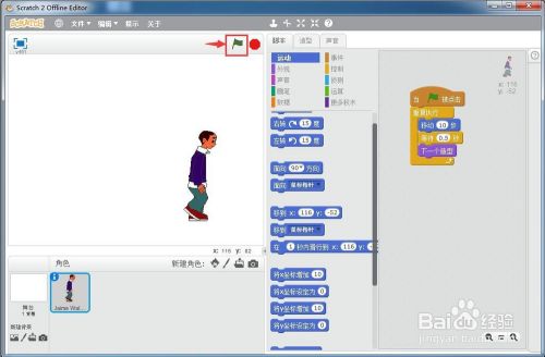点击绿旗执行程序,脚色就起头走路了。
